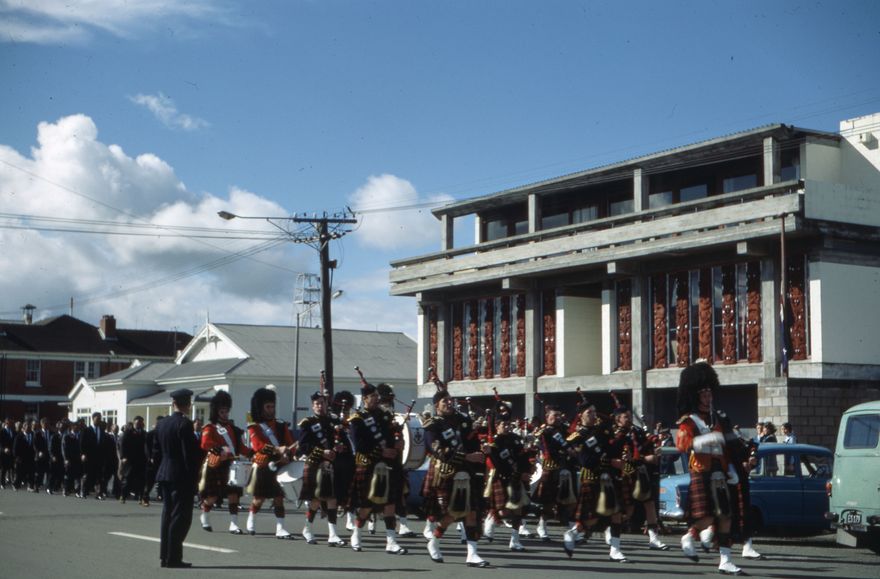 The Manawatū Scottish Society Pipe Band is marching along Cuba Street passing the Māori Battalion Hall, followed by Returned Servicemen, as part of the ANZAC Day commemorative service.