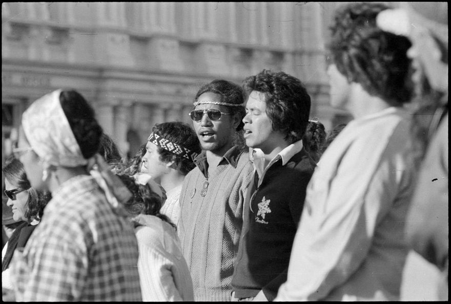 These images were taken for the Manawatu Evening Standard on 6 October 1975, the first of which was published in a photo spread on 8 October under the headline ‘Te Roopu O Te Matakite comes to the city.’ (Note: image AS753_002 was not published).