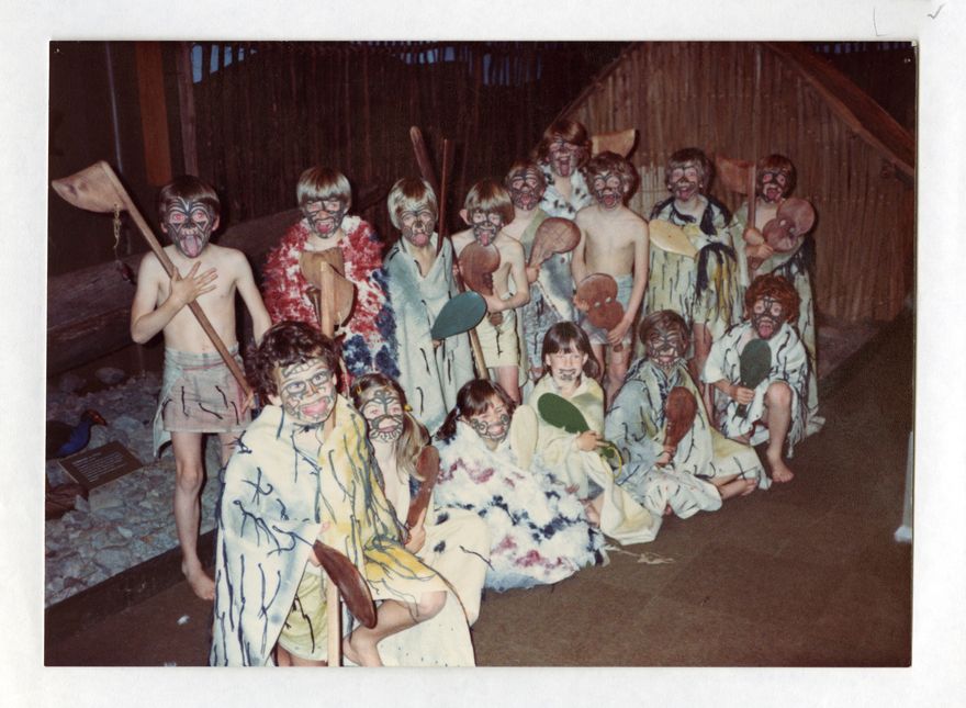 A group of pupils from Aokautere School wear costumes and painted moko as part of a teaching unit on Māori. They pose in front of a museum display. This photo is of historical interest as it reflects the manner in which schools were increasingly teaching their students about non-European cultures, but did not always do so in a respectful, cultural sensitive manner. Aokautere School (formerly known as Fitzherbert East School) was established in 1889.