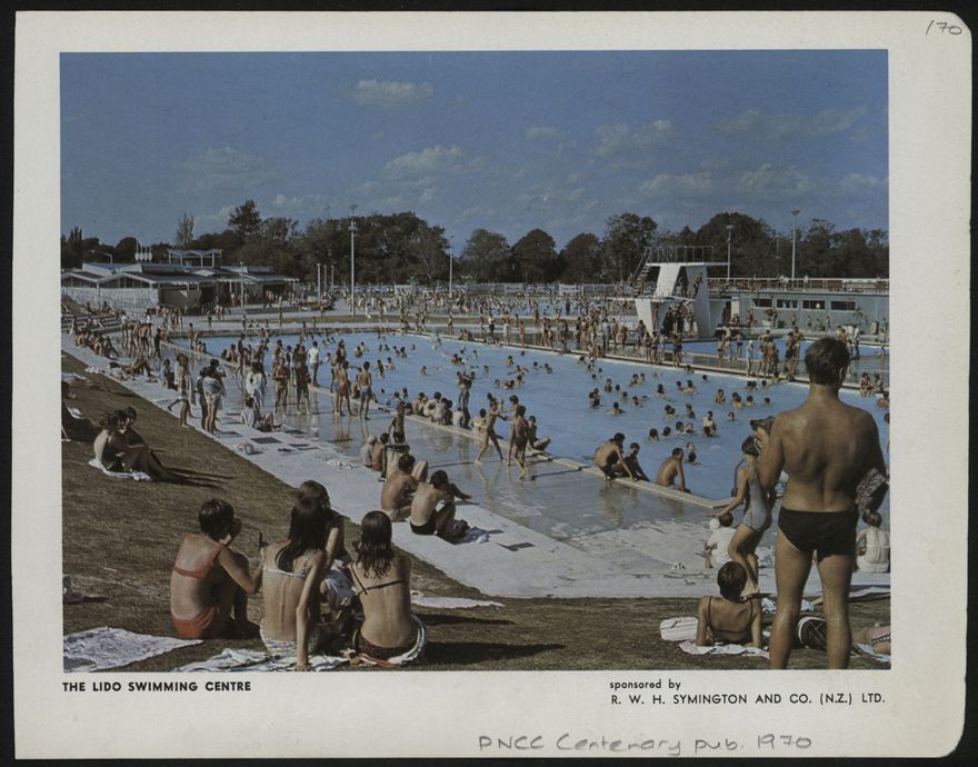 A view of the outdoor swimming pool at the Lido Swimming Complex, Palmerston North. Situated on Park Street, this is still a popular swimming spot for the people of Palmerston North. The pool was planned in 1964, building got under was 23 January 1965 and was officially opened 15 November 1966.