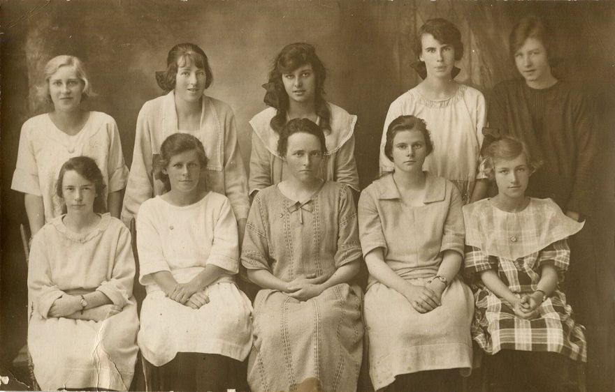 Ten young women, members of a Bible Class at St Andrew’s Presbyterian Church of Palmerston North. Agnes (‘Aggie’) Chapman, second daughter of local sheep and dairy farmer William is seated, front row, centre. For many years an employee in C. M. Ross & Co’s back office (see image 2007N_Pg71_GRO_1106) she was in later years elected an Elder of the Church.
