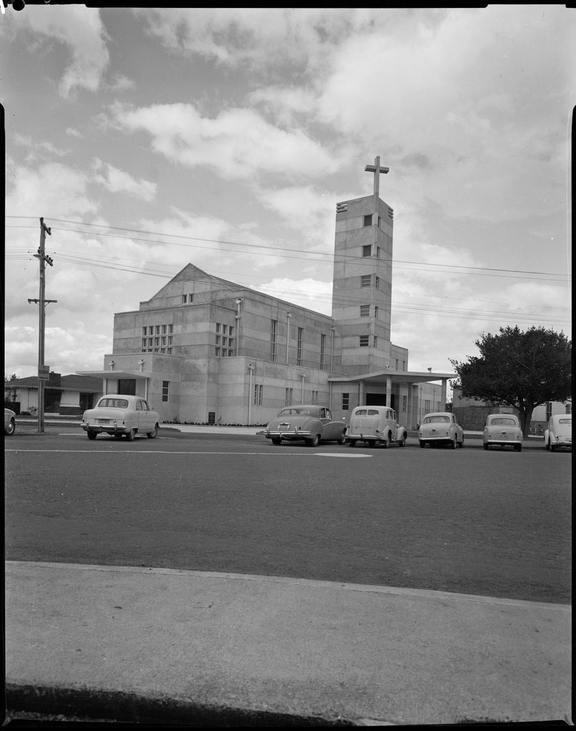 A view of St Peters Church, Ruahine Street. St Peter's Anglican Church was completed in 1961 and consecrated 27 October 1966 by the Right Reverend H W Baines, Bishop of Wellington. The first Anglican service on the site was in a wooden church 4 July 1902.