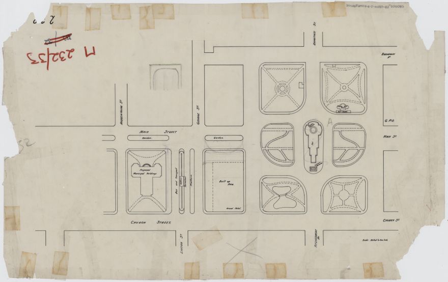 This plan shows a design for The Square, and includes a proposed new civic administration building between Main Street and Chchur Street.