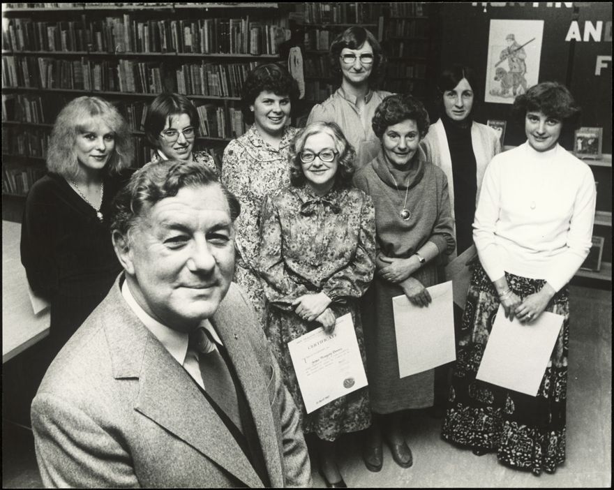 Palmerston North librarians were presented with New Zealand Library Association certificates at a function held at the National Library in Tremaine Avenue. Mr Ian Malcolm, Immediate Past President of the NZLA made the presentations. From left, back: Jennifer Duckett, Palmerston North Public Library; Mary Saxby Palmerston North Public Library; Wendy Hancock, National Library; Joy Hamilton, National Library; Rae Harrison, Massey University Library. From left, front: Ian Malcolm; Joyce Dennis, Palmerston North Public Library; Patricia Purdy Palmerston North Public Library; Jean Neal, Massey University Library