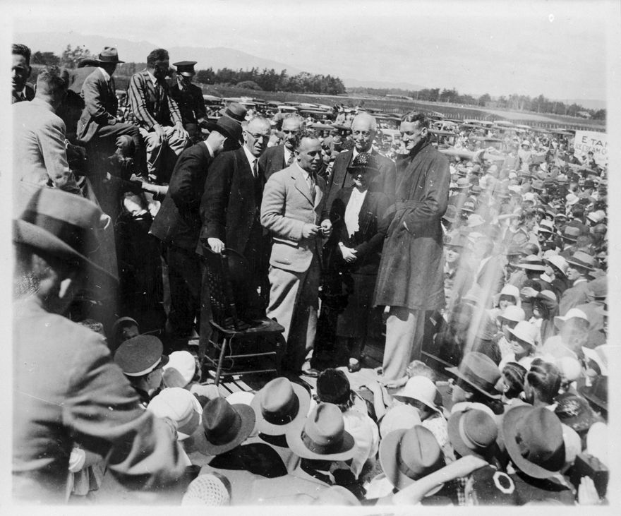 Malcolm Charles McGregor and Henry Campbell Walker entered the London to Melbourne Air Race, 1934, flying a Miles Hawk aircraft, named “Manawatu”, owned by the Manawatu Centenary Air Race Committee. The plane ended in fourth position in the handicap race. Their achievement created much public interest through out New Zealand, and they toured the country displaying the famous aircraft. Standing, facing camera, from left: A E Mansford, Mayor; J A Nash, Member of Parliament for Palmerston North; H C Walker; A Hopwood; Mrs A E Mansford, wife of Mayor (in front); M C McGregor.