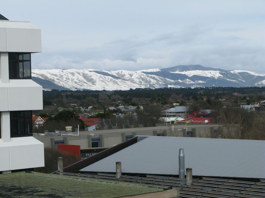 Taken from the 3rd floor of the Palmerston North City Library, at snow on the Tararua Ranges. Looking towards the south east.