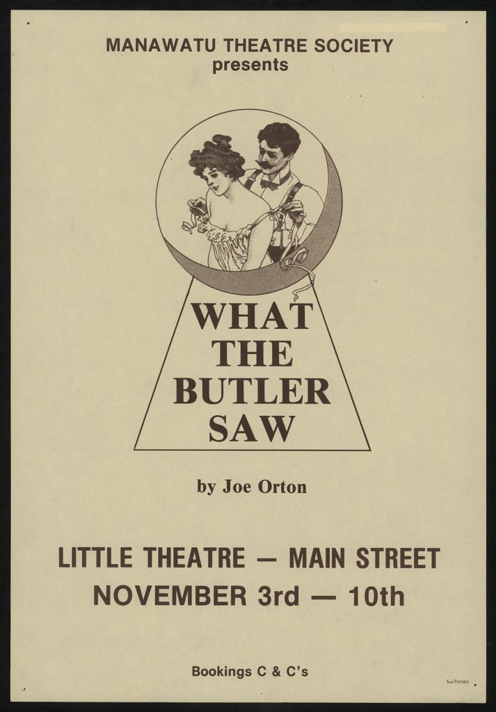 "Manawatu Theatre Society presents What the Butler Saw. By Joe Orton. Little Theatre - Main Street. November 3rd - 10th. Bookings C & C's." Part of a collection of posters that were displayed in the Public Library in the 1970s - 1980s.