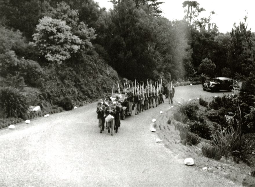 Sir Cyril and Lady Newell (in car) are escorted by students armed with pitchforks, up the driveway of Massey Agricultural College, Palmerston North. Sir Cyril was Governor General for New Zealand 1941 - 1946. Massey Agricultural College, founded in 1928, was the forerunner of Massey University.