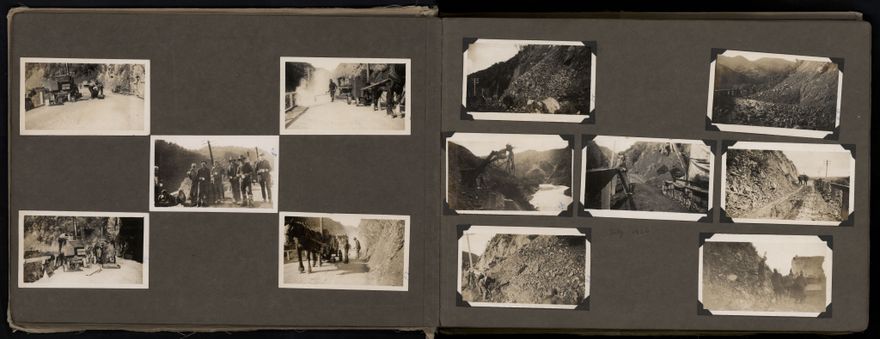Dated from the 1920s and 1930s, this photograph album depicts events on the Manawatū Gorge road including construction and repairs of the road, removing slips, car accidents etc. The album also contains images of Napier following the earthquake of 1931. The photographs were shot by William (Bill) Brockie. Individuals are unidentified.
