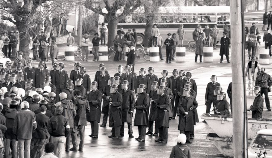 This image was taken (but not used) for a story that ran in The Manawatu Evening Standard on 01 August 1981. Extra police personnel were flown into Palmerston North in anticipation of game-day anti-Springbok Tour and anti-Apartheid protests. The Standard reported there were 1000 police, including a special riot squad, and 5000 protestors. The 1pm March culminated in a 24 minute standoff with the police lines on the corner of David and Cuba Streets.