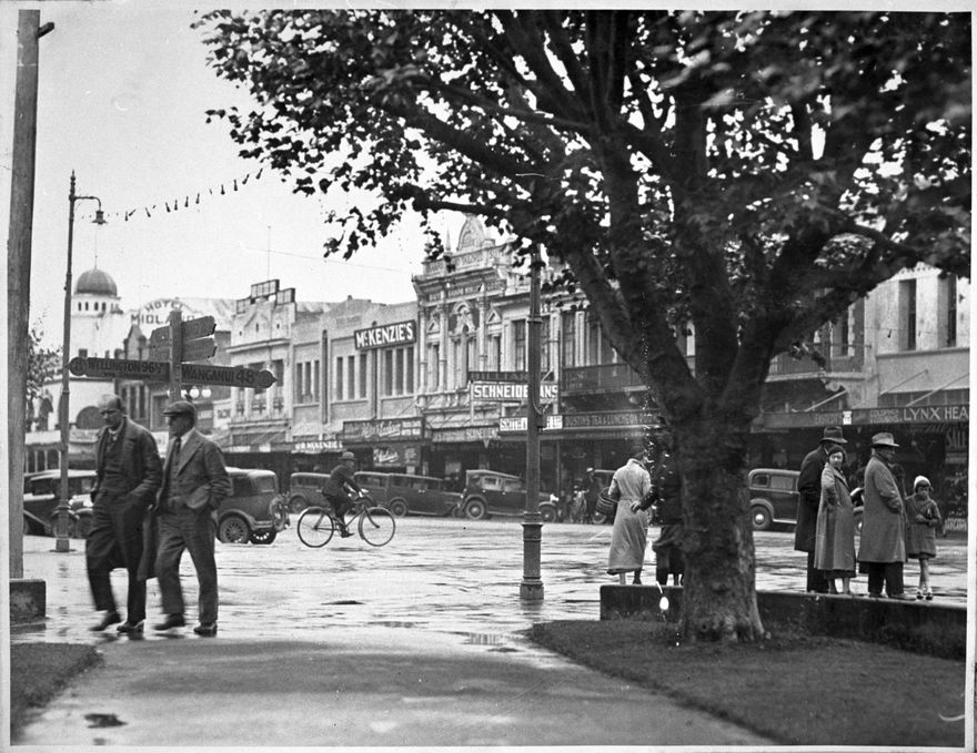 This busy street scene shows people making their way in and around the Square in 1937. Note the domed Midland Hotel, visible in the left side of the photograph.