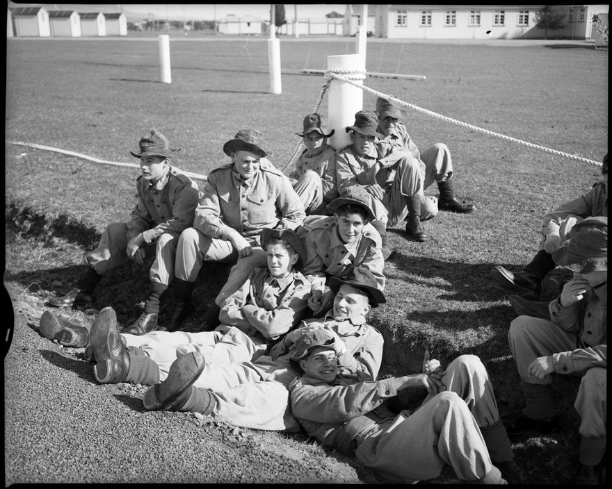 This image was taken for a story that ran in The Manawatu Evening Standard on 28 August 1958, page 8: "These school cadets seem to find it quite comfortable in the trench surrounding the parade ground during the five-minute break yesterday from their pre-n.c.o. training course at Linton Camp. These boys came from several of Palmerston North's secondary schools."