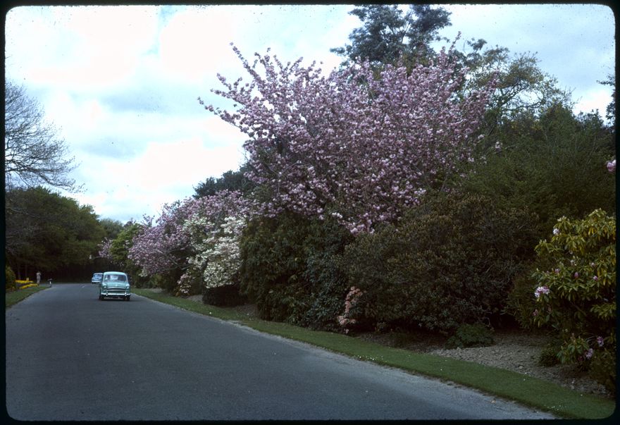 Cars drive through the Victoria Esplanade, under the cherry trees in blossom.
