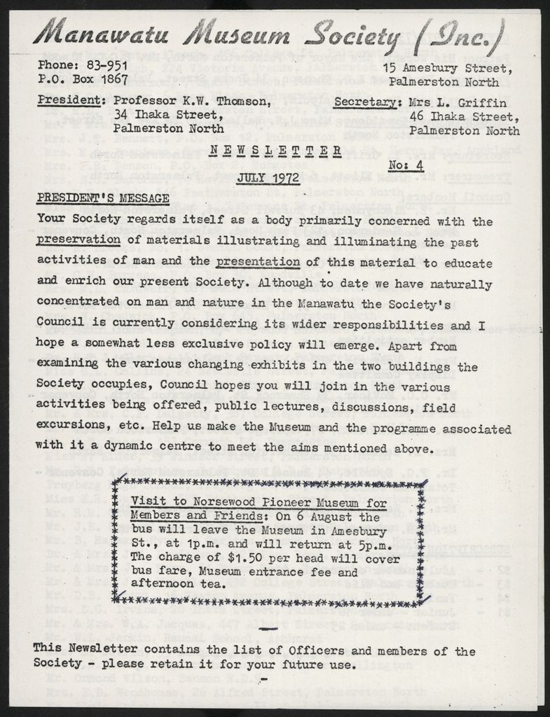This edition of the Manawatu Museum Society newsletter includes a list officers and members of the society.