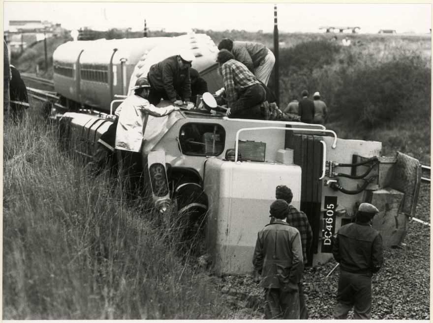 This rail crash occurred two km from the Palmerston North Railway Station on the run to Wellington. The only injuries sustained were those of the driver Mr Mayo while the seven passengers and Wally Wallbutton escaped unscathed. Railways General Manager Mr Trevor Hayward came to the conclusion that the accident was due to the driver speeding as he entered the junction points. See Manawatu Evening Standard 27 August 1981.