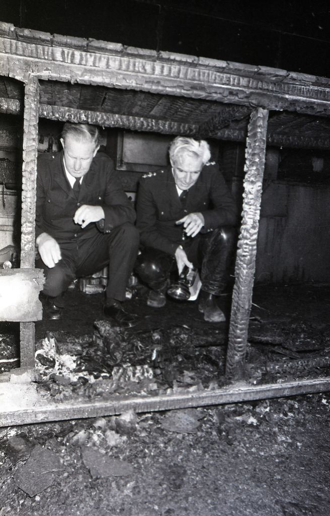 This image was taken for a story that ran in the Manawatu Evening Standard on 8 September 1976 with the caption, "Detective Sergeant Mick Glynn of Palmerston North CIB searches through the ashes under the grandstand's canteen counter." Since publication, the men in this image have been identified as Colin Gardiner (left) and Fred Capes (right) of the New Zealand Fire Service.