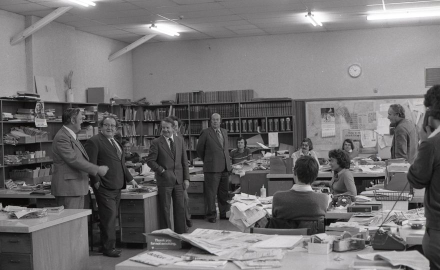 This image was taken (but not used) for the Manawatū Evening Standard on 17th November 1978. Labour leader Bill Rowling toured the back offices of the Manawatū Evening Standard, speaking with staff and viewing publishing equipment prior to the 1978 General Election held on 25th November. Also present is former Labour Member of Parliament Joseph Albert Walding, who regained the Palmerston North electorate with an election night majority of 2601 in the election.