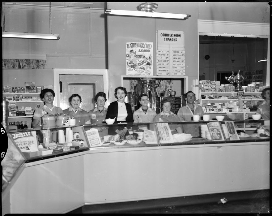 This image was taken for a story that ran in The Manawatu Evening Standard on 15 August, 1959. "The staff of the Palmerston North railway station refreshment rooms have a little respite between the arrival of the four special trains to the second Test match at Wellington today. This picture was taken at three o'clock this morning before the arrival of the first through train. Over 2700 people were expected to be catered for on the four trains."