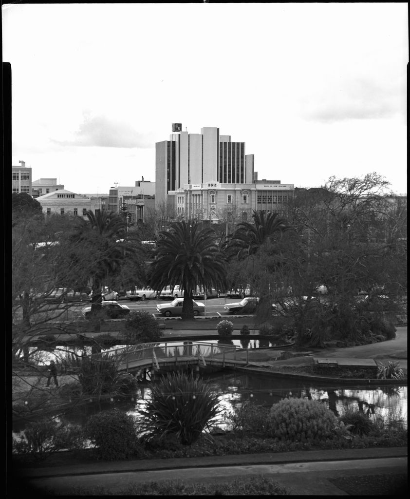 This photograph of The Square Taken was in the vicinity of the Manawatu Standard building. In the foreground is the Lakelet (or Butterfly Lake), followed by the Phoenix Palms that once lived in The Square. The tall building towards the left centre is the Commercial Union Building, situated on the corner of Rangitikei and King Streets. It was completed in March 1973. In front of this is the former Bank of New Zealand. It was demolished for a new multi-storey BNZ.
