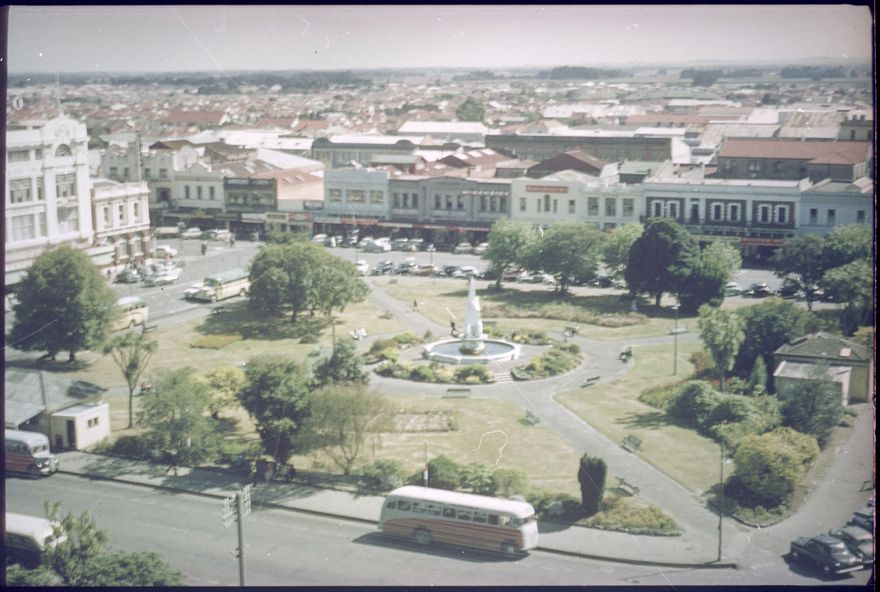This image is from a series taken around 1957 that shows a view of The Square from the top of the Hopwood Clock Tower. This one looks toward the corner of Coleman Place and The Square, including the Coronation Monument. This feature was later moved to the corner of The Square nearest to Broadway Avenue.