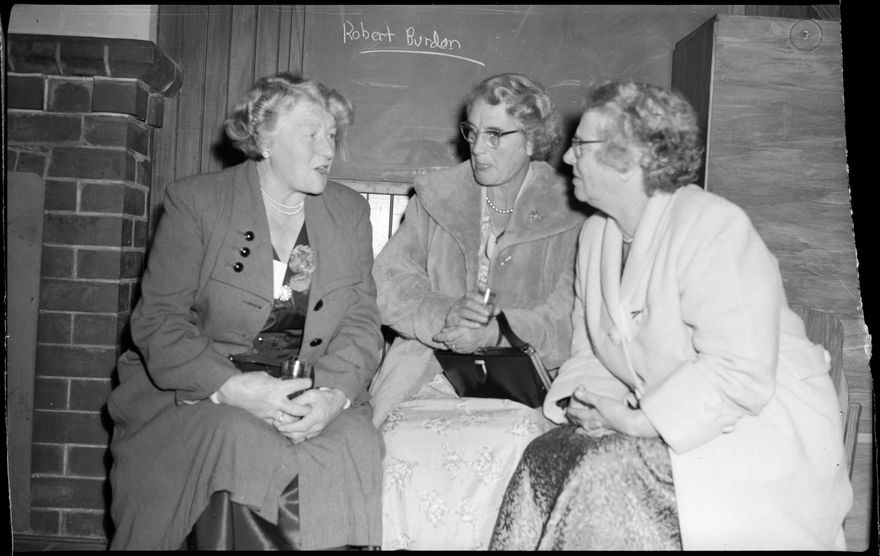 This image was taken for a story that ran in The Manawatu Evening Standard on 24 April 1958, page 16: "Some of the many supporters of the Society of St. George who attended last evening's successful function. Left to right: Mesdames A.E. Norman, D.E. Lawrence and E.M. Gingan."