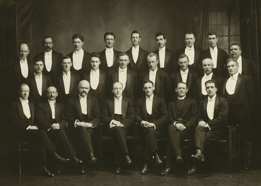 The Orpheus Choir was originally established as the Liedertafel in 1907, to practise and perform songs for male voices. It changed its name to the Orpheus Society in 1915. From left. Back row: I S Perrin; W Leet; George Stout; J Perrin; W G Wilby; W Talyor; P Morgan; J Rodgers; W Mundy. Middle Row: Perrit; Fred Wevell; H Fowler; C Taylor; H Bennett; R Stout; J Davies; W. Jewett. Front Row: W Newlands; J T Barnicoat; R A Fuller; Homes-Runnicles; J Murray; Rev. Blackburn; S Carson
