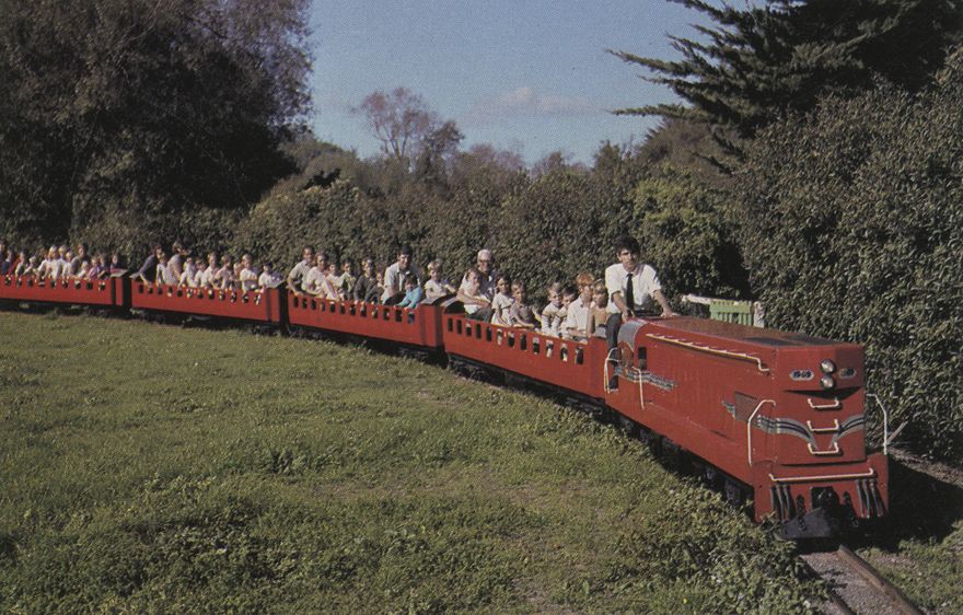 The quarter scale "Da" Locomotive shown taking children on a train ride not long after the Esplanade Scenic Railway opened on 1 November 1969. Originally it was a half mile track running through native bush. Today (2014) a new extension loop takes the railway on a 20 minute ride to the children's playground and back on a track that is 2.2km long. The Esplanade Scenic Railway Society owns and operates the miniature railway in the Victoria Esplanade of Palmerston North. It is one of the largest of its type in New Zealand, with a fleet of three locomotives, ten passenger cars and four specialised carriages for maintenance work. The Society's volunteer crews take turns to act as Guard, staff the ticket office, and drive the trains, and on busy days staff two trains and two stations.