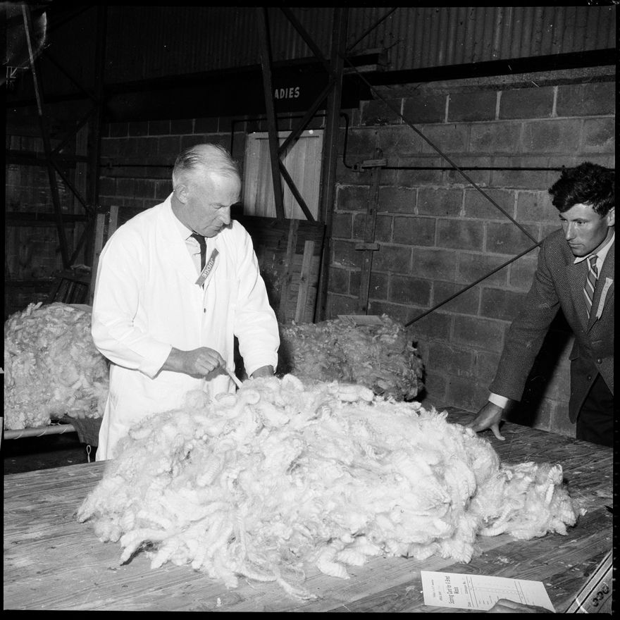 This image was taken for a story that ran in The Manawatu Evening Standard on 24 January, 1964. "Mr C. J. M. Gardener, of the Department of Agriculture, judge in the fleeces section at the Feilding Show. It was the first time he has judged at Feilding."