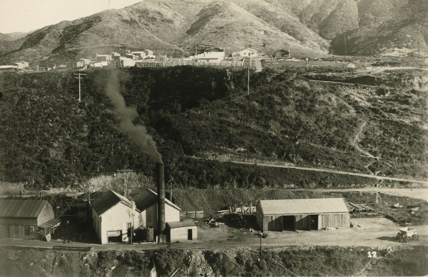 This photograph is one of a series taken between 1922 - 1924 by Charles Wildbore which records the construction of the Mangahao hydro-electric power scheme in the Tararua ranges, east of Shannon. This view shows part of the Mangaore village, which was the headquarters for the project. The Mangahao Power Station provides hydroelectric power and is situated near the town of Shannon. It serves Wellington, Horowhenua, Taranaki, Hawkes Bay, and the Wairarapa. After being delayed by the first world war construction began in late 1919 and the station opened in November 1924.