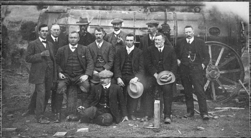 - Opening day of the Waipatiki oil well, 23 miles from Dannevirke. Kotuku Oil Fields Syndicate Ltd began drilling in 1912, with two wells about 2000 yards apart. There are details in an article in the Dannevirke Evening News, 30 August 1912. The well closed in 1921.Standing from left: R Wedderspoon, British Royal representative; A M Slack, Canadian; Unknown; L G Crosse; Unknown; Doctor Riddell. Sitting from Left: Tommy Bain; Unknown; E A Ransom, Mayor of Dannevirke; F A Cowper. Sitting on ground: G J E Pickford, Manager of BNZ.