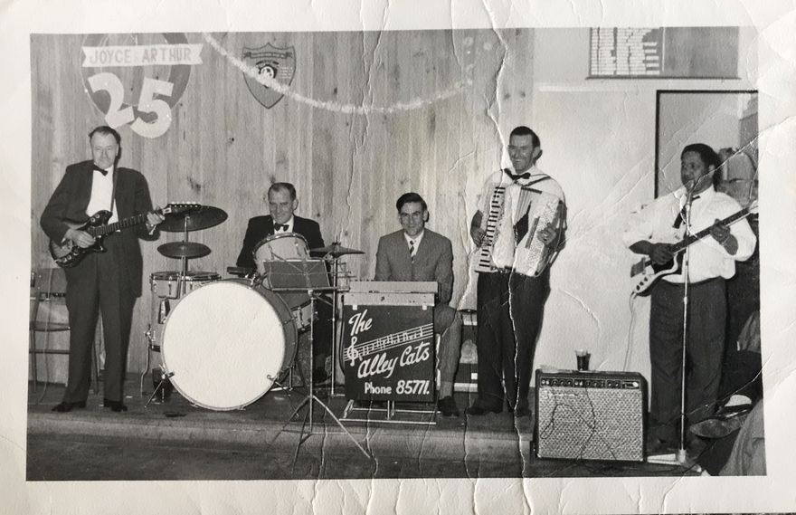 “The Alley Cats” playing at what appears to be at a dance the celebration of a 25 wedding anniversary of Joyce and Arthur. Walter Rumsey on drums. Other players unknown
