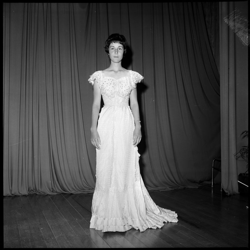 - This image was taken for a story that ran in The Manawatu Evening Standard on 28 February, 1964. "An added attraction at the parade of modern fashion held at the Freyberg High School on Monday night in connection with the "galarama" was the parade of garments bringing memories of the past -- not so much in the past as there is seen many an inspiration for the present day styles. Christine Newell wearing a 60-year-old pink faille ball gown (owned by the late Mrs. P. Mildron) featuring 41 rows of horizontal tucking on the skirt, vertical tucked flounce and fully lined and heavily boned bodice, and was offset by a red silk velvet cape and opera bag."