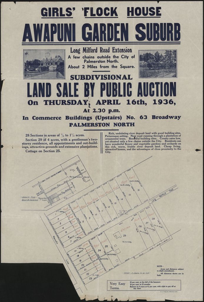 Subdivision sale notice for the land of the former Girl's Flock House on the Long Melford Road extension (later Maxwell's Line) in Awapuni, Palmerston North. The land was divided into 28 sections plus another section for the two storeyed house and land.