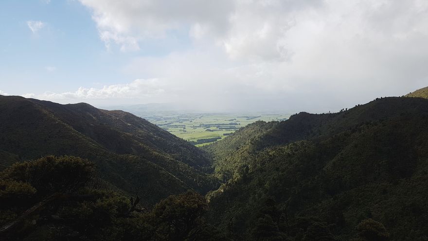 View of Oruakeretaki Valley & Stream and into Hawke's Bay from Kiritaki Hut in the Ruahine Ranges. The valley is accessible via an unmarked track leading down from the hut, eventually terminating at Fairbrother Road.