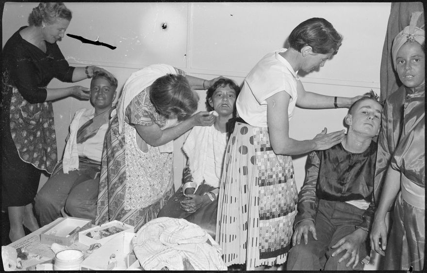 This image was taken for a story that ran in The Manawatu Evening Standard on 8 December, 1959. “Three young artists are seen being prepared for their part in the Ross Intermediate School’s production of “Ali Baba” which had its opening night in the Palmerston North Boys’ High School hall yesterday. From the left to right they are: Mrs H. K. McKay, Dennis Bullock, Miss B. Francis, Ann Mills, Mrs A. M. More and Kerry Martin.”