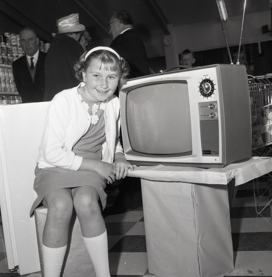 This photograph ran with the caption, "Nine-year-old Carol Anne Ford, seen with the television set she won in the Manawatu Consumer Co-op "Place a Game" contest. Second prize, a refrigerator, was won by Mr W.J. Jones and the third prize, a waste disposal unit, went to Mrs J Jones."