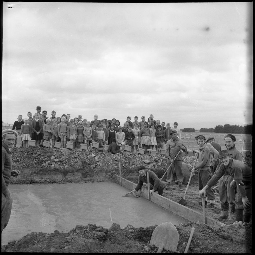 This image was taken for a story that ran in The Manawatu Evening Standard on 10 May, 1963. "Work progressing on the new swimming baths at the Te Arakura School yesterday. Over £500 has been collected by parents and local residents towards the cost. In addition voluntary labour is keeping the cost down. Considering that the school has only 50 pupils the effort is a worthy one. The children were gathered yesterday to watch the concrete being poured and the look of pleasure could be seen on their faces. It is hoped that the new baths will be ready for the next summer season."