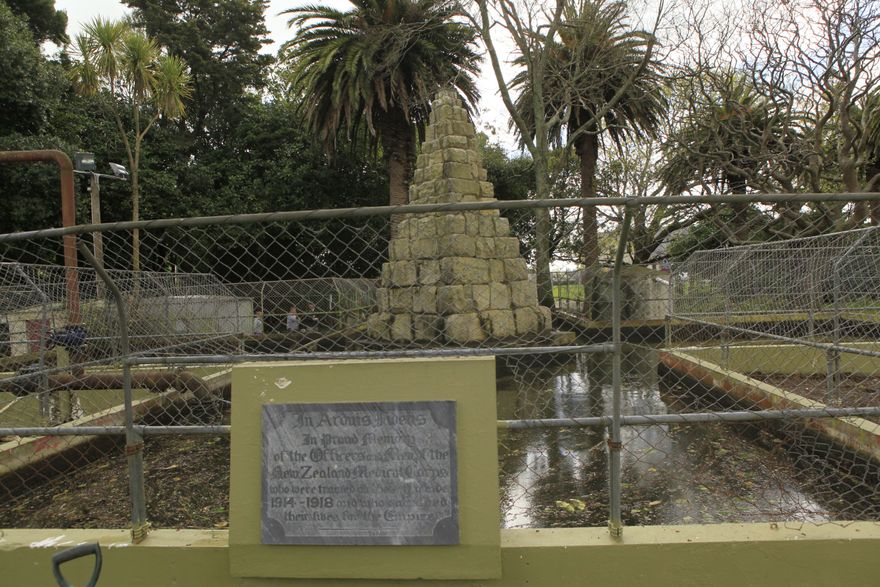 The memorial, dedicated to the memory of officers and men of the New Zealand Medical Corps (1914-1918) who were trained at Awapuni Racecourse during WWI, was erected in 1929. The memorial is a stone cairn fountain, inside a pool constructed in the shape of a cross.