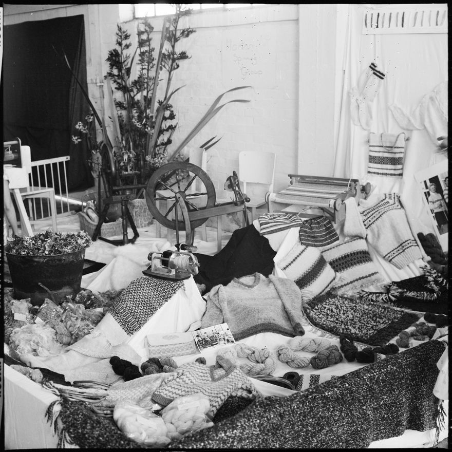 This image was taken for a story that ran in The Manawatu Evening Standard on 27th January 1966 ""Sit by the wheel and spin." Marton spinners drew much admiring comment with their demonstrations in the display hall at the Show."