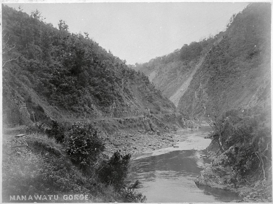 The Manawatu Gorge is shown looking westward, with the road on the left. It appears there has been some recent slips on both the left and right banks.