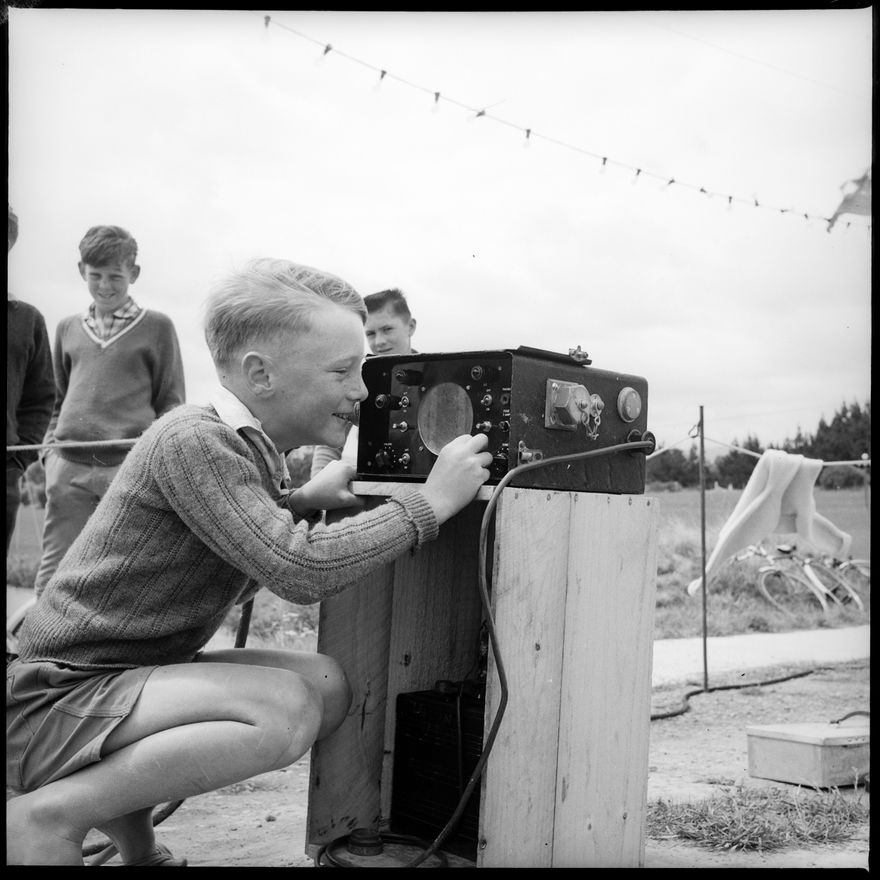 This image was taken for a story that ran in The Manawatu Evening Standard on 18 January, 1964. "Terry Jenkins, aged eight (above), calls the boy in the diver's helmet, Stephen Phillips, aged 12 (left), on a communications link set up at the Carnival of the Lake by the Navy. The link is used by Navy divers and the boys were given the chance to try it out as a part of the carnival." This image is of Terry Jenkins. See also: 2017N_2017-20_018318.