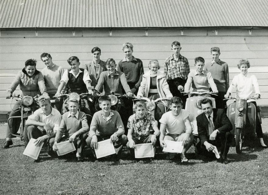 The Palmerston North Motor Cycle Training School was run by Stan Key. This class, held at the Central Normal School from 13 January - 7 March 1959, was the 14th to graduate. The 17 students used their own motor bikes and scooters for the course, or there was a limited number that could be borrowed. A Certificate of Proficiency was awarded at the end. Course participants (average age 17 years) from left. Back row (standing) Errol Dean; Donald Campbell; Unknown; Kevin Richards (1st in class); Peter Larsen. Middle row (on bikes) Olaf Cohr or Robert Drake; Robin Daw; Unknown; Pamela Burman; Warren Burgess; Diane Nicol (2nd in class). Front row: Barry McLean; Barry Evans; Robin Harrison; Alister Smith; Unknown; Jan Van Der Baak. Other unidentified class participants were: Brian Elliot; Peter Evans; Menzies Hallett