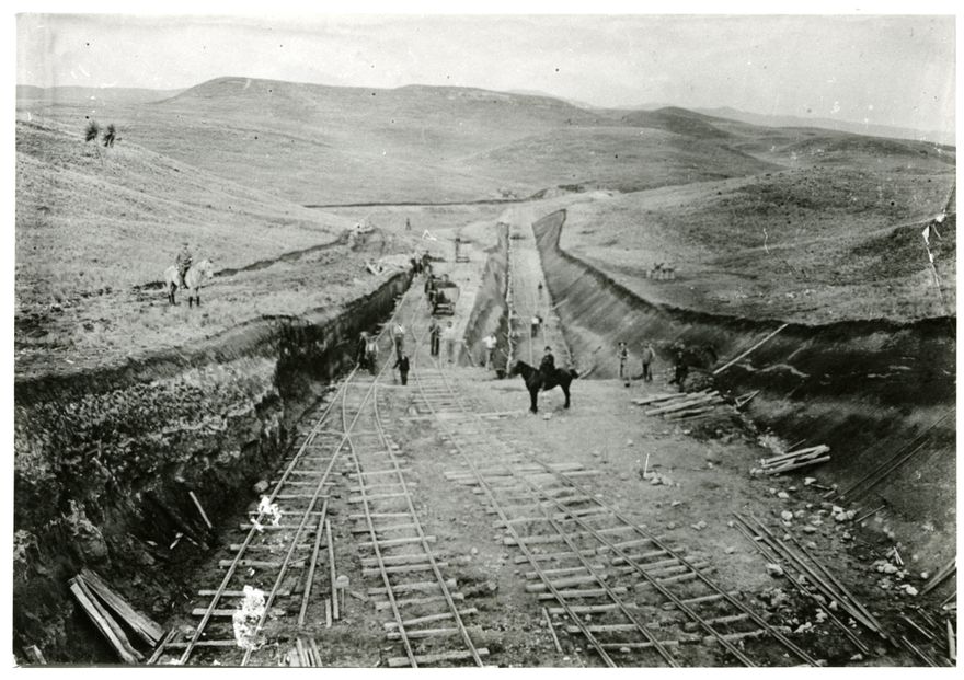 The construction of railway tracks at an unknown location assumed to be in the Manawatū in the 1890s or early 20th century.