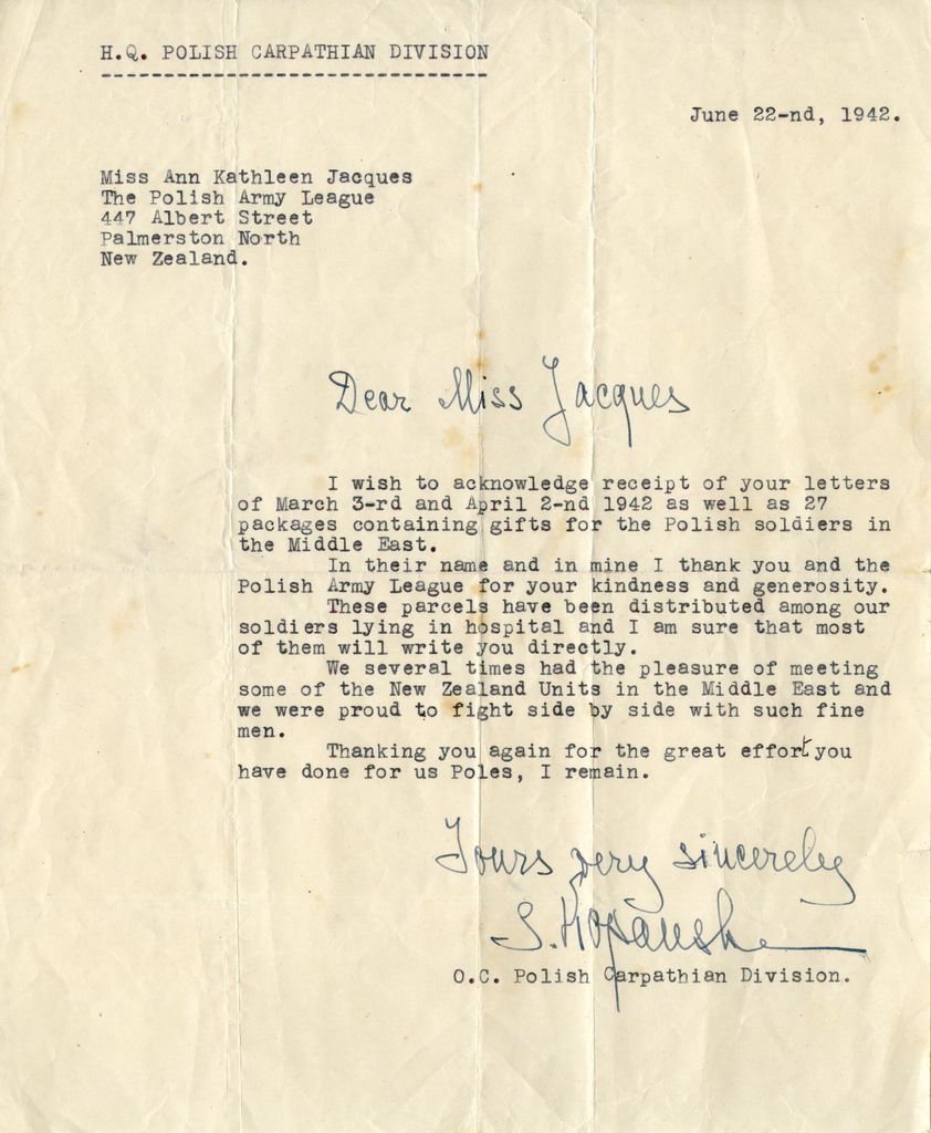 Letter from S. Kopanski, O.C. Polish Carpathian Division to the Polish Army League, thanking them for parcels and the work they are doing. The Polish Army League, founded in Palmerston North in WWII, corresponded with and sent parcels to Polish soldiers who served with the allies in World War Two.