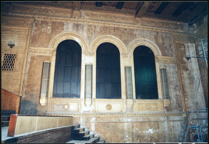 The Regent Theatre under construction during re-development work in 1996-1997. The Regent Theatre was built by the Australasian cinema and theatre chain J.C. Williamson Limited. Williamson's began its New Zealand operation in 1926. The theatre, one of several Regents built throughout New Zealand and Australia at this time, was a dual-purpose cinema and theatre. The Melbourne architect Charles Hollinshed was hired to design the building which was completed in 1930 at a cost of £46,000, becoming the largest and most lavish auditorium in the city. It retained its twin functions for much of its life, before falling into relative disuse and eventually closing in 1991. The Palmerston North City Council purchased the building 1993 and began restoration work in 1996. The Regent Theatre is a now rare survivor of the heyday of the theatre/cinema. As the only such venue in Palmerston North to survive to this day, the Regent is of great social importance to the city. The exterior design, and to a much greater degree, interior design are remarkably authentic and rare examples of theatre design in New Zealand, and as such, the Regent is a landmark building in type and style. The exterior is built in the Art Deco style, while the interior is Persian painted plaster ornament. The external symmetry, vertical fins, shallow stylised relief, stepped skyline, and chevron ornament are typical of the Art Deco style. The main entrance, with walls of coloured plaster and travertine, leads into a large barrel-vaulted, double height space, off which there are the entrances to the main performance space. The interior decoration of the theatre is taken directly from Owen Jones' book on design, “Grammar of Ornament.” The auditorium seats 1393 people in a two-tier circle and stalls arrangement (originally it accommodated 1600 guests). Architect, Charles Hollinshed graduated from Sydney University in 1922, one of the first three graduates in architecture in Australia. With A.H. Walkely, Hollinshed practised in Melbourne and the firm specialised in theatre and cinema design. One of their best-known designs was Her Majesty's Theatre, Melbourne (1934). Hollinshed also design Hoyts Limited (with Richard Gailey) the celebrated "Spanish Gothic" Regent Theatre, Brisbane (1929), now demolished.