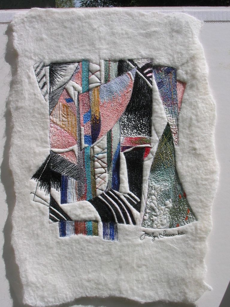 Spring Song by Jocelyn Seccombe. Cotton, silk and polyester threads machine embroidered onto hand-felted wool, 2007. Held in a private collection.