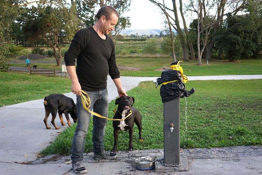The water fountain at He Ara Kotahi is taped up to stop human use but dogs can still use it. Here Carl and his dog Miho stop for a drink. Carl isn't too phased about the lockdown - his main concern is that he can't but pies. "We should still be able to get takeaways..."