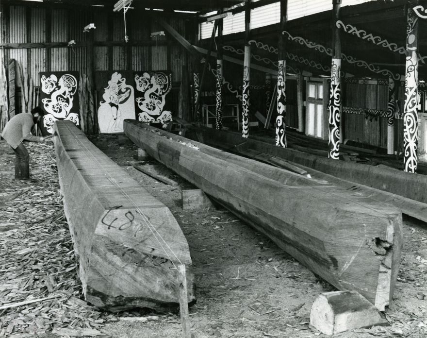 I tikina ngā rakau totara ki Pahiatua mai i te ngahere o Whirinaki i te marama o Hakihea i te tau 1979. Ko te kaiwhakakairo i roto i te whakaahua ko Fred Clamp. Ko te kaiārahi ko Mātahi Avauli Whakataka-Brightwell. I neke atu te waka ki Porirua kia oti ai, ā, i te tau 1985 i haere atu te waka o Whakataka-Brightwell rāua ko te kaiwhakatere ko Francis Cowan nō Tahiti, mai i Tahiti, ki Rarotonga, ki Aotearoa e orite nei ki ngā haerenga o Ngātia Arawa me Tainui i ngā wā i mua. Nā ngā whetu i haere ai te waka. The two 20 metre totara logs were brought to Pahiatua from the Whirinaki Forest in December 1979. The carver in the photograph is Fred Clamp and the project was led by Mātahi Avauli Whakataka-Brightwell. The double-hulled waka was made to traditional standards and in 1985 sailed the traditional route of Te Arawa-Tainui from Tahiti to Rarotonga then south-west to Aotearoa.
