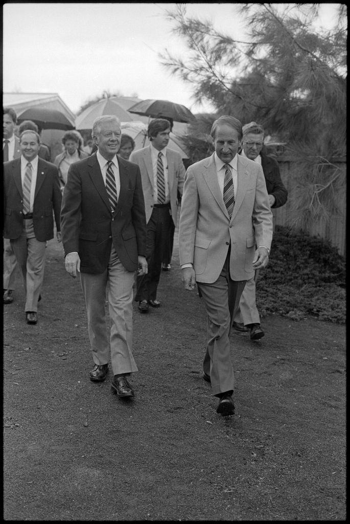 This image was taken by the Evening Standard on the 11th of February 1984 but was not published. It depicts former United States president Jimmy Carter and his wife Rosalynn visiting Highden Park - Herrick and Judy Perry's thoroughbred stud farm at Awahuri.