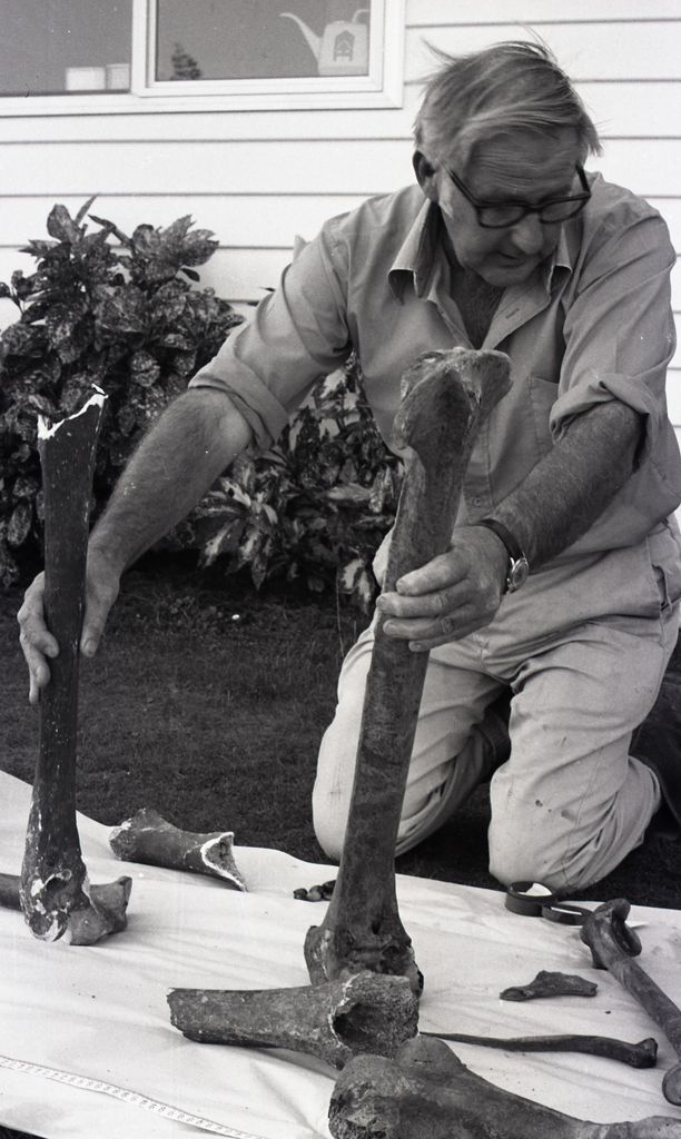 This series of images were taken for a story that ran in The Manawatu Evening Standard on 29 April, 1982. “A well-preserved set of moa bones found on a Levin farm this week will have to be identified by an expert. The bones – a foot and a leg from a large bird and bones from a smaller bird – were found during clearing of a drain 1.5 metres deep on Mr Collis Blake’s farm at Ihakara, north of Levin. R Lou Gurr (left), a former reader in zoology at Massey University, said the large bones definitely came from the “big moa” but the species still had to be identified. He said the bird could have been as tall as 3.5 metres. Mr Blake’s grandfather found a similar set of bones in 1916 in Wairarapa.”